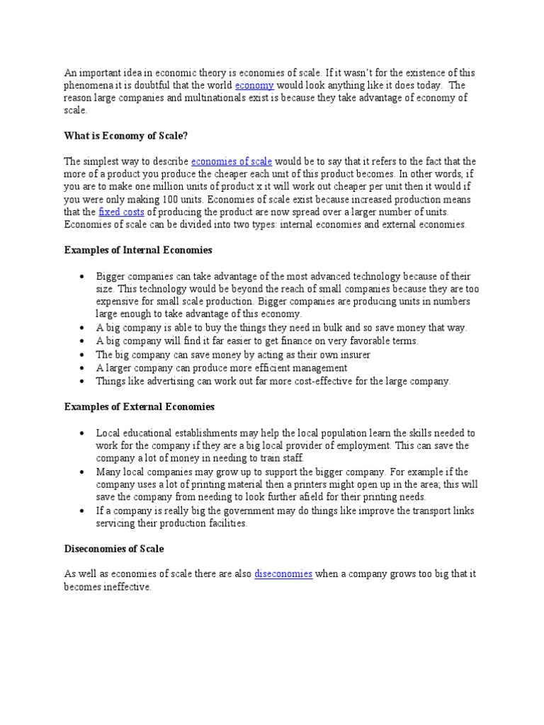This requires a combination of fixed cost degression and business. Economies of scale are the cost benefits gained by companies when production becomes more economies of scale most directly affect production costs. When a firm expands its scale of production, the economies, which accrue to this firm, are known as internal economies. Economies of scale apply to a variety of organizational and business situations and at various levels, such as a business or manufacturing unit, plant or an entire enterprise. Technical economies are the cost savings a firm makes as it grows larger, arising from the increased use of large scale mechanical processes and machinery. Economies of scale are sometimes classified into internal and external economies of scale. The scale of production has an important bearing on the cost of production. Economists say that economies of scale were a significant driving force behind the industrial revolution, which started in england and spread across europe and beyond from the period between. Kashmira shah an employee of crompton limited and also head. Internal diseconomies and economies of scale. Although economists wrote about these effects long ago, models of trade developed after the 1980s introduced economies of scale in creative new ways and became known as the new trade theory. Economies of scale occur when a business benefits from the size of its operation. Companies can achieve economies of scale by increasing production and lowering costs.