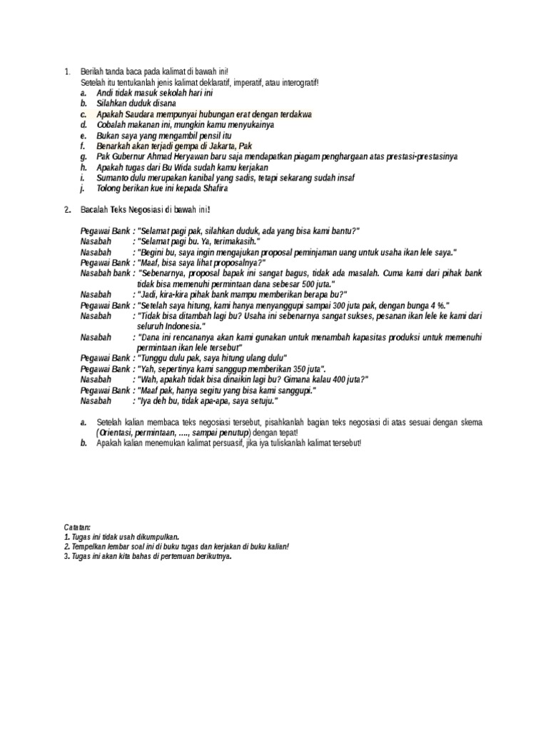 Terjawab • terverifikasi oleh ahli. 20 soal yang bertemakan tentang bab teks negosiasi.deskripsi lengkap. Interaksi sosial yang berfungsi untuk menanyakan alamat d. Dalam teks negosiasi, bagian pemenuhan biasanya memberitahukan tentang barang atau permasalahan agar lawan intraksi menjadi lebih paham. Salam pembuka dan menanyakan kepentingan pembeli.